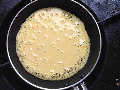 Panaskan wajan anti lengket. Saya menggunakan wajan teflon diameter 12 cm. Tuang adonan sebanyak satu sendok sayur ke wajan. Tunggu sampai permukaan adonan berlubang.